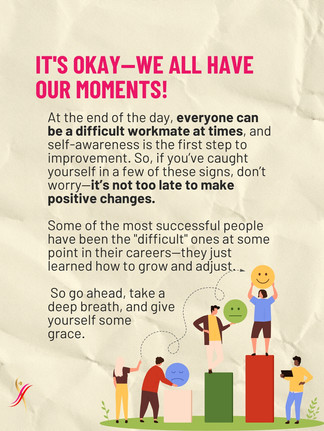 We all have times when we’re a bit hard to work with (yes, even the nicest colleagues). The key is recognizing these habits and being willing to adjust. After all, nobody’s perfect, and sometimes, a little self-awareness can go a long way. It’s not too late to make positive changes!